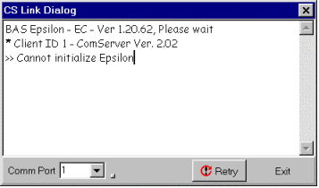 - Check the cable between computer and epsilon. Verify the computer comm port number matches the number in the dialog box.