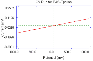 - Run the experiment. The plot should be a sloping line going through 0 from -0.1 mA to 0.1 mA (as shown below).