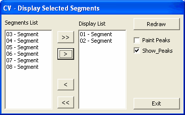Choosing Selected Segments in the Select Graph options allow one to view and print selected segments of the CV experiments. The dialog box (Fig9) will initially show all segments in the display list. One can move all segments out of Display list with the << button and move all into the Display list with the >> button. Highlighted individual and multiple segments can be to move out of the display list < or into the display list >. Once the desired segments are listed, then clicking the Redraw button will redraw the graph with only the selected segments shown. Two other options with the display are whether to Show Peaks (show the baseline and peak lines) and whether to Paint Peaks (show shading for area of peak).