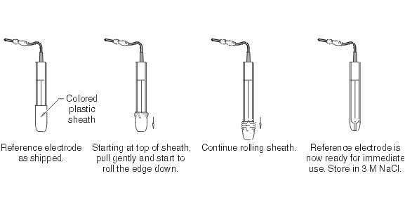 Every Ag/AgCl reference electrode is shipped with a colored plastic sheath that covers the porous tip and retards drying. Immediately upon receipt, remove this sheath by rolling it down from the glass body to the tip. The plastic will roll down and slide off the end of the electrode. Do not tug at the sheath or hold the electrode by its lead while you are doing this. If you have trouble removing the sheath, make a small cut at the upper edge of the sheath using small scissors, and try again.