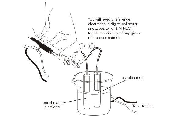 The Ag/AgCl reference electrodes are easily ruined by drying. Keep the tips wetted at all times and store in 3 M NaCl when not in use.
