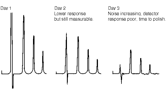 You can live with decreased response if you are still able to quantitate the peaks of interest and if you periodically inject a set of standards. In many cases, a light buffing of the working electrode surface with a methanol-soaked lab tissue is all that’s needed to restore the electrode. Try this first! If such a treatment improves the response only slightly, then the use of polishing abrasives is the next logical step.