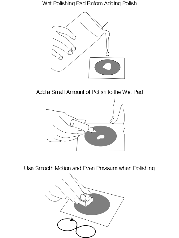 - Only one grade of polishing slurry is to be applied to the pad; that is, use a different pad for each polishing step. Do not add fresh polishing compound to pads once a particular polishing step has been initiated; add sufficient slurry at the beginning. If additional lubrication is required, add water to the pad.