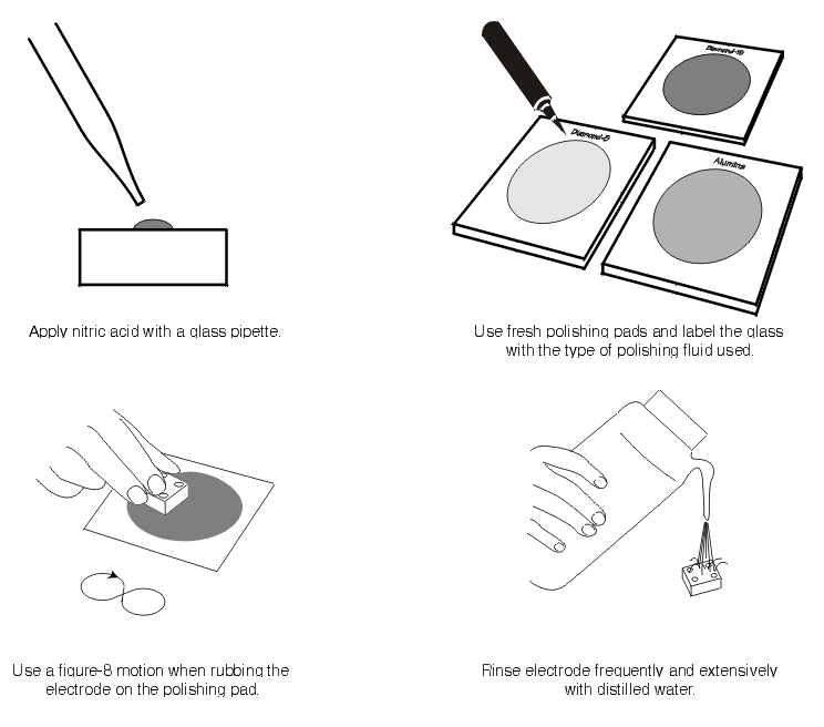- Place the electrode face down on the pad. Polish as above. After 1-2 minutes, remove the electrode and rinse well with DISTILLED water.