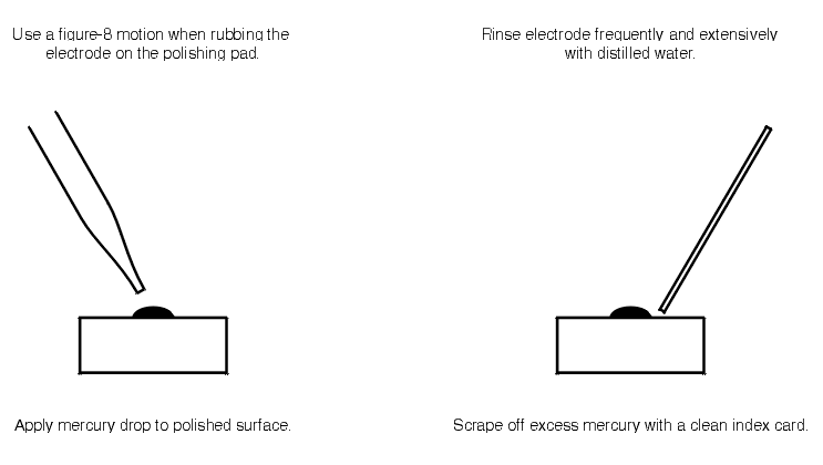 - To form the amalgam, place a drop of TRIPLE-DISTILLED MERCURY on the gold electrode. Slightly roll the drop around to make sure that it evenly touches the gold in all places. Wait 5 minutes, then use an index card to push off the excess mercury into a waste vessel. Polish the mercury surface with a lab tissue to produce an even layer.