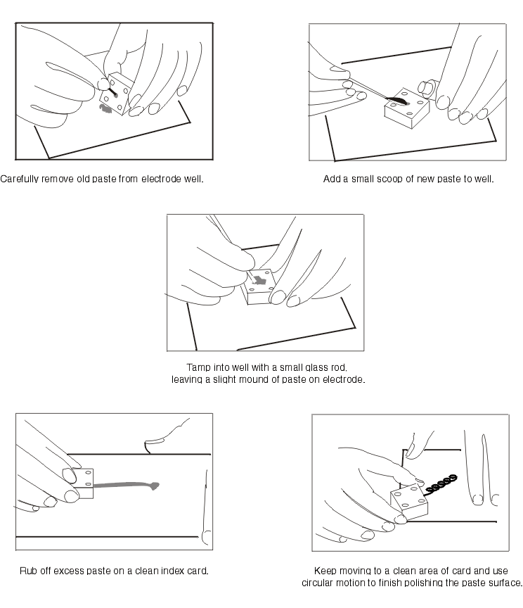 - If you have been using an electrode and wish to resurface the paste, simply remove about a millimeter of the paste by wiping it away with a lab tissue. Then proceed by dropping a little lump of paste onto a card, pressing the electrode down onto this lump and proceeding as above.