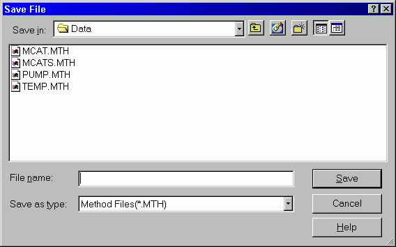 To save a Method, either click the Save button from any of the Method screens, or take the SAVE option from the Method drop-down menu. A dialog will open up allowing you to save to the location of your choice with the name of your choice: