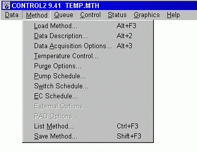The nerve center of ChromGraph Control is the Method file. The Method contains all the information about how to do a series of runs: how many runs, which detectors and which filter settings to use, what pump settings to use, the duration of the run, the data collection rate, etc. In addition, the Method screens provide the means to manually control the various instruments -- you can turn detectors on and off, start and stop the pump, and set all the conditions so the system can equilibrate.