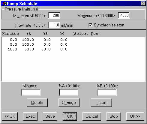 EXEC sends a command to the epsilon hardware to set the conditions called for in the dialog box (e.g., pump speed, detector conditions). For screens with multiple time lines (e.g., Pump Gradient Schedule) the conditions on the 0.0 time line are activated.