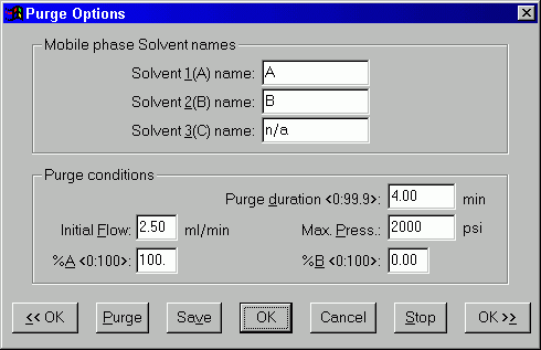 A purge can be used to bring fresh mobile phase rapidly through the system. The pump will attempt to maintain a user-chosen pressure by varying the flowrate. If the chosen pressure limit is not reached (e.g., if the purge valve is open) the pump will increase flow to its maximum, 5 mL/min, and hold that flow rate for a user-chosen duration.