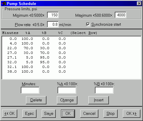 GRADIENT SCHEDULE LISTBOX contains the pump instructions for a timed run. There must be at least two lines here: a 0.0 minute start line and an end line. Up to 10 lines may be entered in the gradient schedule; they will be automatically sorted by time. The first event must have time 0.0, and subsequent events must be at least 0.1 minutes apart. For each line of the listbox, enter the time and the percentages for bottles A and B (C is automatically calculated as the remainder). When bottle percentages differ between lines, the software will calculate the appropriate linear gradient between the two lines.