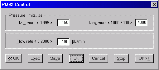 MAXIMUM and MINIMUMPRESSURE are the safety limits for the pump. For most chromatography, we recommend a pressure minimum of 200 PSI and a maximum of 4000 PSI. If the pressure falls below the set minimum, or rises above the set maximum, the pump will stop and report the appropriate error.