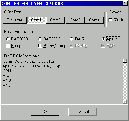 Press the OK button next. The Equipment Options screen should come back with entries in the 'BAS ROM Versions' section, indicating that the software is communicating with the epsilon system. Press OK again and this screen will be replaced by a picture of a chromatograph.