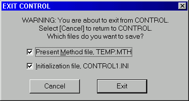 PRESENT METHOD FILE allows the current Method to be saved as temp.mth every time you exit, and therefore reloaded automatically at the next session. This temporary Method differs from your original Method in that it remembers the last run number and comes up ready to do the next run in the sequence.