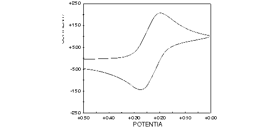 Let's take the case of the well-behaved electrochemical couple ferricyanide/ferrocyanide. This is a one-electron oxidation between two forms of iron held in a very stable hexacyano complex. Figure 1.10 demonstrates the oxidation and reduction of these complexes by cyclic voltammetry. Both reactions occur at positive applied potential.