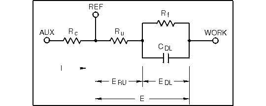 Since the potential is applied between the reference and working electrodes, the user's control of the distribution of this potential between Ru and the interfacial double-layer impedance is impossible. The reference electrode may be moved closer to the working electrode (thereby minimizing Ru, but the term Ru will always be present to some degree. For this reason, Ru is termed the uncompensated resistance. CDL is the double-layer capacitance (this capacitance is charged up when the detector is turned on, and is the cause of the initial off-scale transient) while Rf is the faradaic resistance. The latter term represents the resistance to charge transfer across the interfacial region.