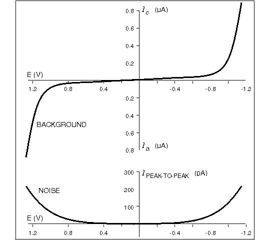 Both the analyte signal (peak height) and peak-to-peak noise are plotted. Each increment of added area adds proportionately less to the output signal, but adds linearly to the output noise. The smaller the electrode, the greater the signal-to-noise ratio. For this reason, large plate electrodes, porous flow-through cells, and other large surface electrodes demonstrate no advantages in terms of the SNR. If you intend to use the "Jumper" to couple the dual electrodes together, you should expect to see a less favorable SNR. The experiment might still be useful if you are trying to differentiate a particularly small peak and need a larger signal. Since noise depends on potential, it follows that the smallest minimum detectable quantities will occur in cases in which the substances of interest are easily oxidized or reduced. Figure 1.17 demonstrates the value of judicious potential selection.