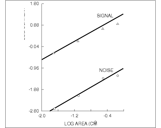Figure 1.15. Signal and noise for electrodes of different surface areas. The solid lines indicate the increase in current expected for a linear response in area.