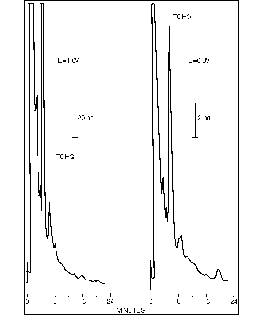 Figure 1.17. Detection of tetrachlorohydroquinone (TCHQ) at two different applied potentials. This illustrates the specificity of electrochemical detection, which can in turn influence the sensitivity. Determination of the optimum applied potential is not unlike determination of the optimum wavelength used in UV detection methods.