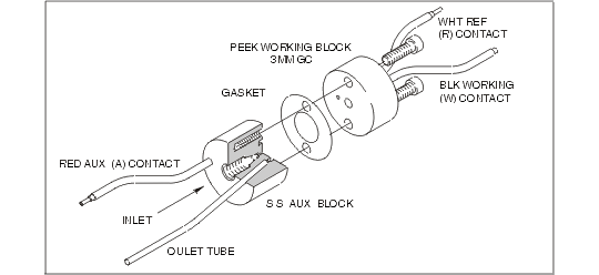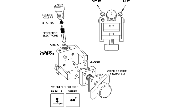 Bioanalytical Systems established a new standard for its cross-flow electrochemical transducers in the BASi 200A and BASi 480 liquid chromatography systems (Figure 1.2). As from the beginning, the proven thin-layer concept remains central to this design. In it, two blocks form a sandwich around a thin fluoropolymer gasket which defines a microliter flowcell. Two working electrodes (glassy carbon or other material) are embedded along one wall of the channel, whereas the reference and auxiliary electrodes are directly opposite, typically only 50 micrometers distant.