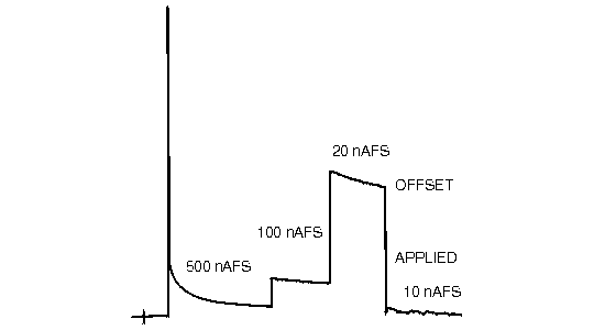 The background current is electronically canceled by the offset current applied by the user. This results in a steady baseline at recorder zero (Figure 1.4). It is always desirable to operate with the minimum absolute background current to optimize sensitivity. The chromatogram is recorded "on top" of a current which often exceeds the peak heights for eluted compounds. High background currents increase the susceptibility of the instrument to noise (e.g., pump pulsations) and can result in serious nonlinear (negative) deviations in calibration curves.
