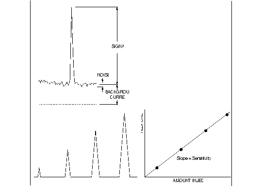 Figure 1.5 summarizes in graphic form the various parameters useful in evaluating detector performance. These are often confused in real practice. Sensitivity is the slope of the response versus amount. Detection limits refer to the amount of analyte required to give a signal X times greater than the noise (usually X = 3). The two terms are not synonymous. The reader should be able to foresee situations in which two detectors demonstrate equal sensitivity but unequal detection limits. The only difference necessary is the noise. We recommend that LCEC users report sensitivity for each peak of interest as well as the noise. With this information, it is possible for the reader to predict a reasonable detection limit for each substance being determined.