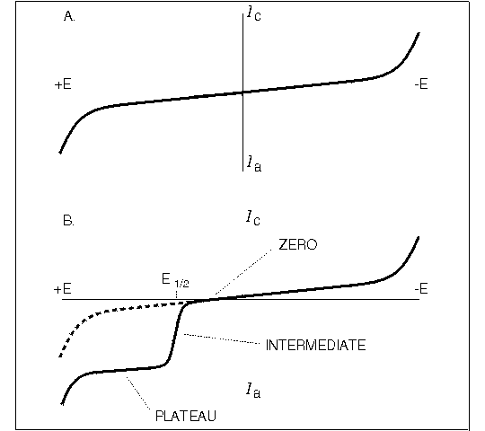 Figure 1.6. Hydrodynamic voltammogram for mobile phase alone (A) and solute in mobile phase (B). The waveform for the solute is characterized by the half-wave potential E1/2.