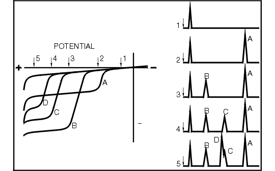 The curves have different oxidation potentials, as exemplified by the wave locations. Each compound also has its own particular limiting current, depending on such factors as the number of electrons transferred, the rate of that transfer from bulk solution to the surface, and the type of electrode surface used. Substance A, for example, is easier to oxidize than C, but yields a greater current response due to some combination of the above factors. Detecting A is very simple via LCEC. By setting the potential at 2, A may be clearly measured with no response from B, C, or D. In order to detect C, however, the potential must be set at a value which is sufficient for oxidation of B and A as well. Selectivity in this case is also dependent on the chromatography. Figure 1.7 also illustrates the chromatograms that would be obtained for potentials 1 through 5. Note that once in a plateau region, the current response for that compound is the same for any higher potential. Also, the farther one moves out in potential, the greater the number of compounds that will show up on a complex chromatogram. At potential 5, the selectivity (both electrochemically and chromatographically) is inadequate to permit separation of C and D.