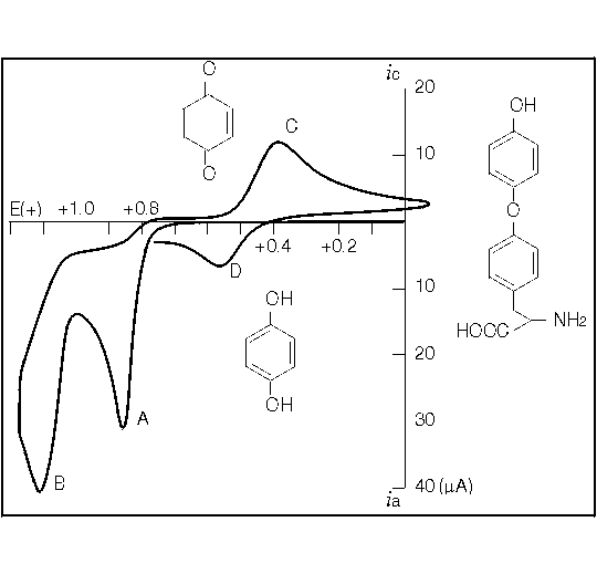 Figure 1.8. This cyclic voltammogram of thyronine tells us that a potential of +0.85-0.90 V is necessary to detect it. It also undergoes an interesting follow-up reaction which could be detected by dual-electrode LCEC.