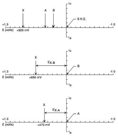 Figure 1.9. Potential axes for two reference electrodes (A and B) vs. the standard hydrogen electrode (SHE) (top). Referencing all potentials relative to reference electrode B would translate the potential axis (bottom left). The applied potential for a hypothetical analyte X will now be less when expressed versus reference electrode B. If reference electrode A were used, even less applied potential would be necessary (bottom right). Both situations provide equivalent oxidizing power.