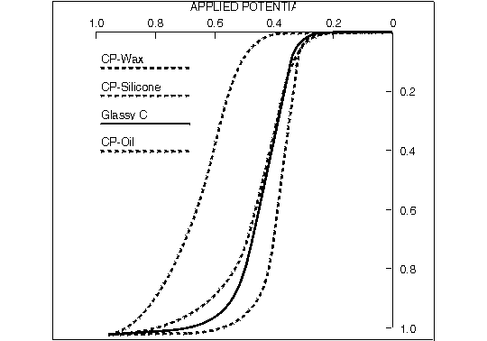 The sharpest break with potential occurs on the CP-O while the broadest voltammogram occurs on the CP-W, indicating that faster electron-transfer kinetics occur on CP-O relative to CP-W. The CP-S and glassy carbon electrode materials exhibit kinetics similar to CP-O. Fast electron-transfer kinetics characterized by sharply rising voltammograms improve the selectivity of the overall determination. Some carbon paste formulations (graphite mixed with hydrocarbon and fluorocarbon polymers) show slower kinetics, similar to the CP-W described above. The sensitivity or response for a given amount injected is approximately the same in the diffusion-limited region, but for these materials, a greater potential is usually required for equivalent response.