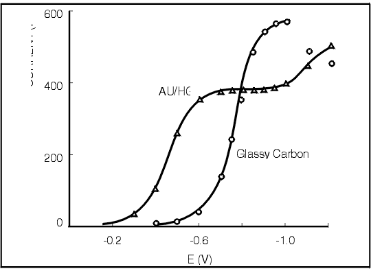 Electrochemical reactivity can be altered considerably by changing the electrode material. In many cases, this can be highly advantageous. The large hydrogen overpotential characteristic of mercury electrodes in protic solutions extends the attainable negative potential range (past carbon) and makes difficult reduction reactions possible. For this reason, mercury remains the material of choice in these potential regions. However, the reduction of dissolved oxygen, a very facile reaction on mercury over a wide potential range, does not occur until well into the negative-potential region on a glassy carbon electrode. Thus, the oxygen overpotential of glassy carbon is much better than that of mercury (Figure 2.2) and precludes the need for oxygen purging at moderately negative potentials.