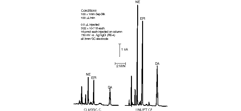 Figure 2.4. Comparison of chromatograms from BASi classic and UniJet cells at low flow rates.