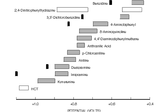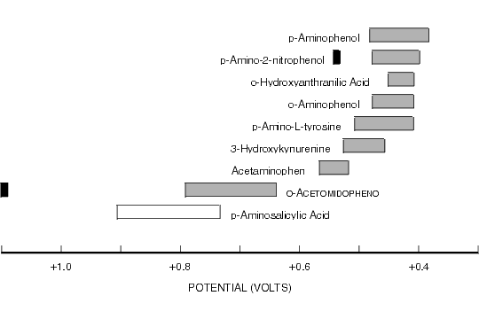 The following tables will help to summarize a great deal of information about the redox characteristics of a variety of molecules. This information can be used as a guideline when evaluating the feasibility of detecting these compounds using LCEC techniques. Information concerning the applied potential is not absolute; you will need to confirm the optimum using hydrodynamic voltammograms and the electrode and mobile phase necessary for your assay.