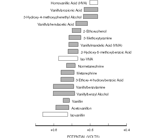 Figure 8.5. Oxidative Cyclic Voltammetric Data for Some Vanillyl Metabolites of Tyrosine and Related Compounds.