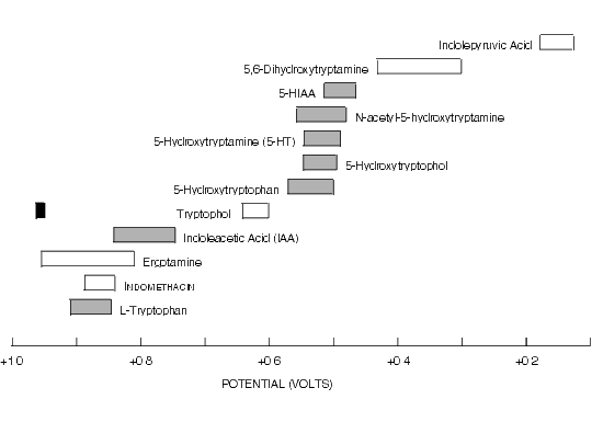 Figure 8.6.Oxidative Cyclic Voltammetric Data for Some Indole Metabolites of Tryptophan and Related Compounds.