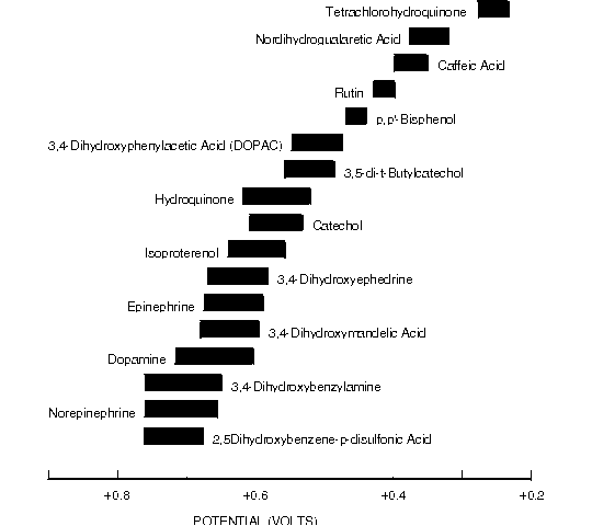 Figure 8.7. Oxidative Cyclic Voltammetric Data for Biologically Important Catecholamines and Other Easily Oxidized Diphenols.