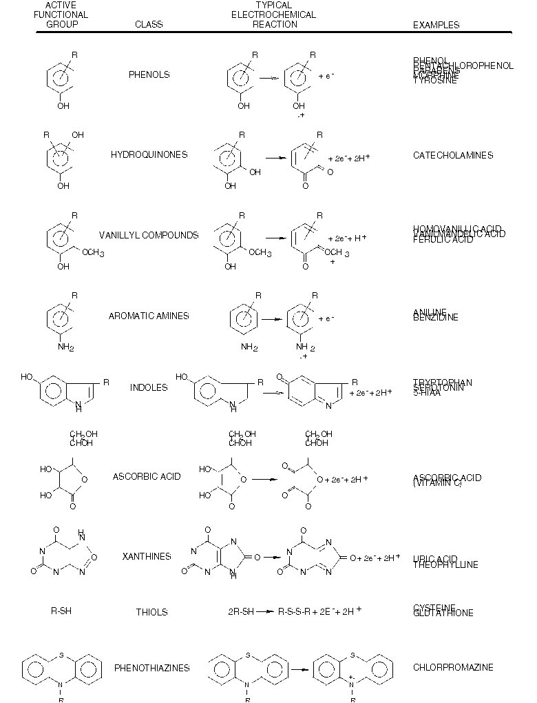 This section will primarily deal with typical functional groups that can be oxidized, but the list generated below is by no means exhaustive. The only conclusive way of knowing if a compound is electrochemically active is by a technique such as cyclic voltammetry. Even with our experience, we cannot always guess at how a specific compound may behave. A voltammetric assessment can provide information about the reversibility of the reaction as well, which can influence a decision on which mode of LCEC to use (e.g., Dual Series). In general, for electrochemical oxidation to take place, one can look for the same features and reactive centers as one would for a homogeneous oxidation reaction (e.g., delocalized electrons, stability of product, etc.). This does not mean that if a homogeneous chemical reaction does take place then this is directly applicable to the heterogeneous electrochemical reaction. The correlation is often thought to occur, and is many times an incorrect assumption.