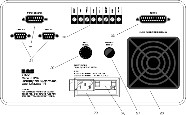 The power cord attaches to the PM-80 via the receptacle on the rear of the instrument. The pump can be operated with either 100, 120, 220, or 240 VAC and 50 or 60 Hz power, but the correct voltage must be selected before use at the cord connector: