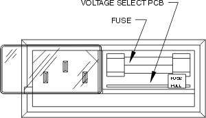 Should the power option need to be changed, unplug the line cord and slide the plastic window to the left. The orientation of the small circuit board now exposed in this socket determines the voltage option. If the voltage labeled on the outer edge of this board is not that required, pull out the board and turn it such that the desired voltage is readable. Reinsert the board and push the fuse holder back into the cavity. Also check to see that the fuse is the proper rating:
