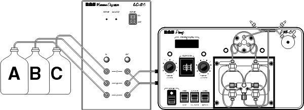 Connect the three solvent-uptake lines to the ports marked 'A', 'B', and 'C' on the left side of the pump. Be sure to observe the correct orientation for the flangeless ferrules. The solvent-uptake frits should be placed into three bottles of freshly filtered mobile phase. (For initial startup, cleaning, etc., you may put all three uptake lines into the same bottle of 40:60 acetonitrile:water or other appropriate solution.) For best results, elevate the mobile-phase bottles to provide hydrostatic pressure to the pump.