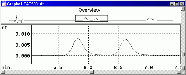 OVERVIEW WINDOW enables a second window which always shows the entire chromatogram. When a section of the main graph has been enlarged with the Zoom Cursor, the enlarged section is indicated on the Overview Window by a rectangle. The relative sizes of the Overview Window and the main graph can be adjusted by dragging on the border between them with the mouse.