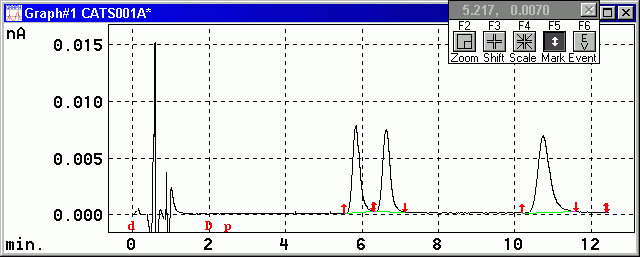 To use this feature, first click the Event button. Then press the appropriate key so the letter code for the function of choice appears above the cursor. Position the cursor over the baseline, then press the insert key to insert an event, or the delete key to remove an existing event. The events are inserted or deleted from the Method in RAM, and any changes will appear in the Processing Events dialog box. The Data file must be processed for the changes to be put into effect. Subsequent Data files also will be processed with the changed events. SAVE the Method to make the changes permanent. If it becomes necessary to restore the original Events, do not save the changed Method: instead, reload the original Method.