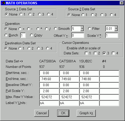 The MATH OPERATIONS section allows you to manipulate the data in various ways (e.g., baseline subtraction).
