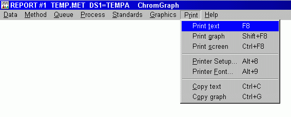 ChromGraph offers various options for printing. For example, via the Report Options section of the Method you can instruct Report to send all output to the printer. Also, various other menu options employ LIST DEVICE boxes which permit you to send that task's output to the printer. Occasionally you may want to print or capture only the screen currently displayed. Options in the PRINT MENU afford that opportunity: