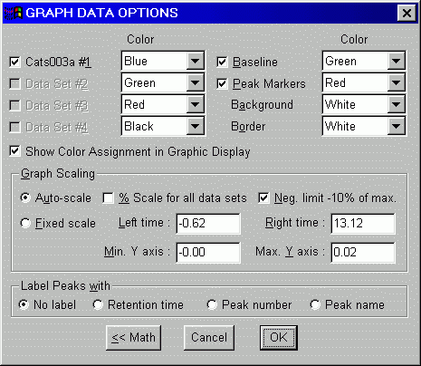 Each Data file in RAM will be listed in the dialog box. Simply click on the check box to request that one or more of the Data files appear in the graph. A drop-down listbox allows selection of a unique color for each Data file.