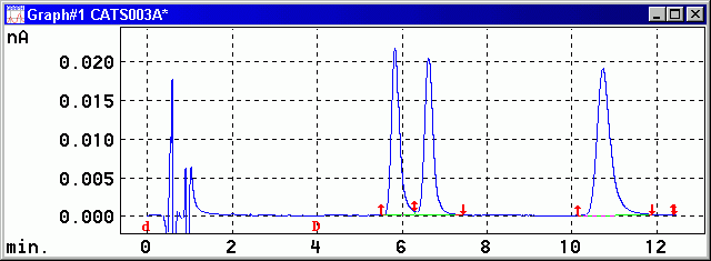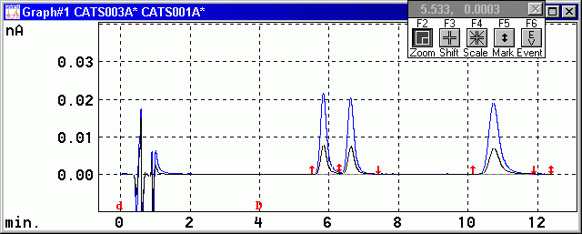 There are two drawbacks to automatic scaling. First, since each graph is separately scaled, it's hard to do visual comparisons of several Data files processed in a batch: as each file is processed and graphed, it will be maximized to fit the graph. (NOTE: peak heights, areas, and calculated amounts from the report are unaffected by scaling. These numbers may be used for comparing Data files.)