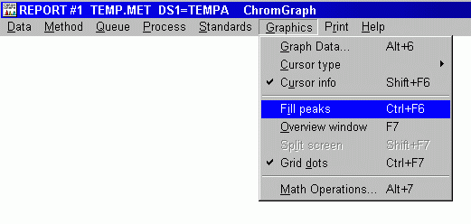 FILL PEAKS colors in the area under each peak. Peaks will be filled with the line color selected for that Data file. If several Data files are graphed simultaneously, only the most recently processed Data file will have filled peaks.
