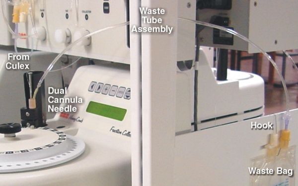 This new approach also requires caution by users. The BASi Culex ® tubing set was intended to be used for one animal, and is warranted for that purpose. We have found some laboratories reusing the same tubing sets for several animals. Repeated use of the new blood waste technique beyond an estimated maximum of 30 samples will probably lead to failure of the waste collection technique. Thirty samples should be more than enough to accommodate the use of one rodent, even with duplicate sets of blood samples as in a bioavailability study. Users who continue to re-use the same tubing set will encounter serious problems with leakage of waste material into the fraction collector.