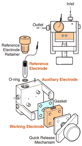 A complete flowcell consists of two separate BASi® part numbers, one for the Auxiliary Electrode, the other for a Cell Kit.